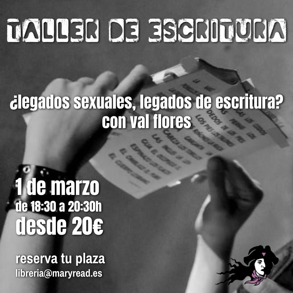 TALLER DE ESCRITURA ¿Legados sexuales, legados de escritura) 1 de marzo de 18.30 a 20.30h 20€ con disponibilidad de tarifa precaria (y de apoyo). Reserva tu plaza en [email protected]