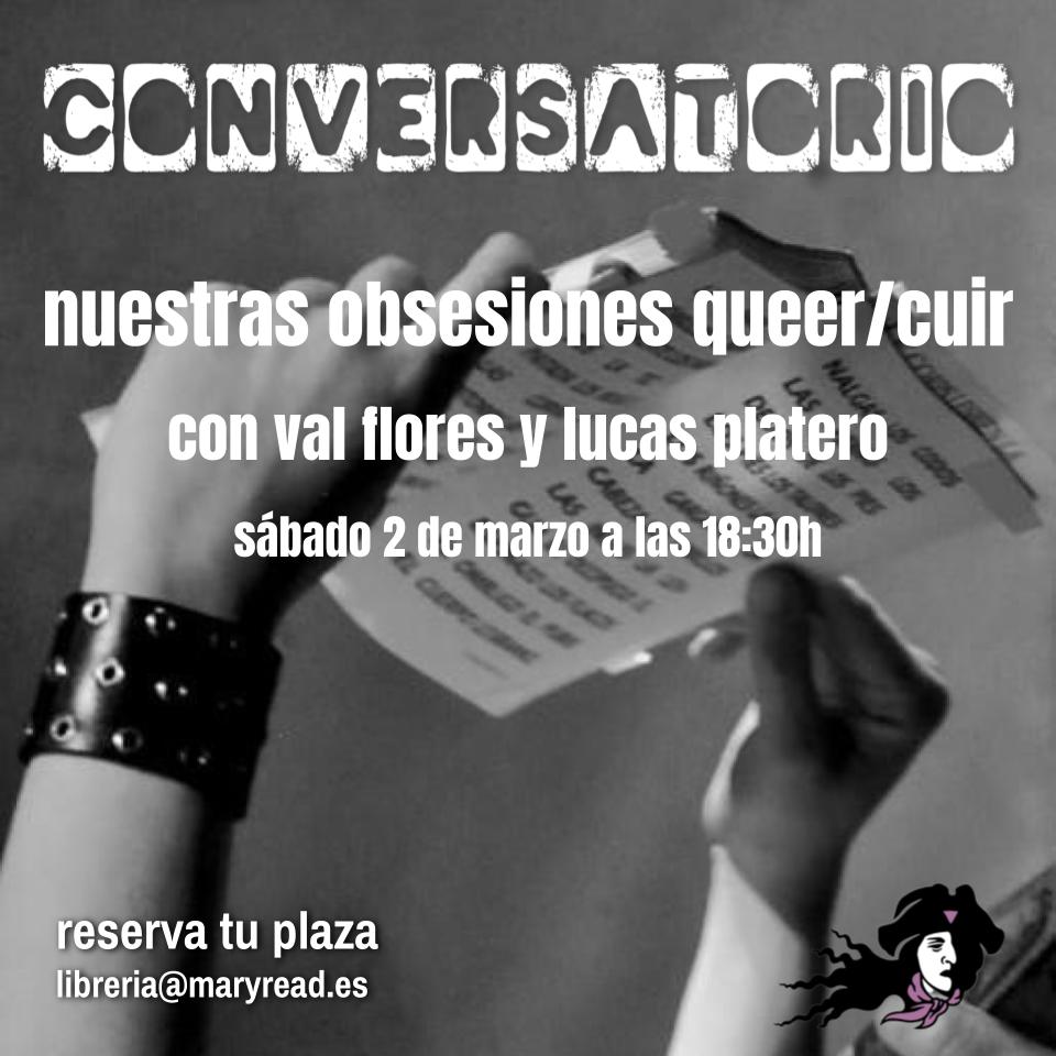 CONVERSATORIO entre val flores y Lucas Platero: nuestras obsesiones queer/cuir Reserva tu plaza en [email protected] 2 de marzo de 18.30 a 20.00h.